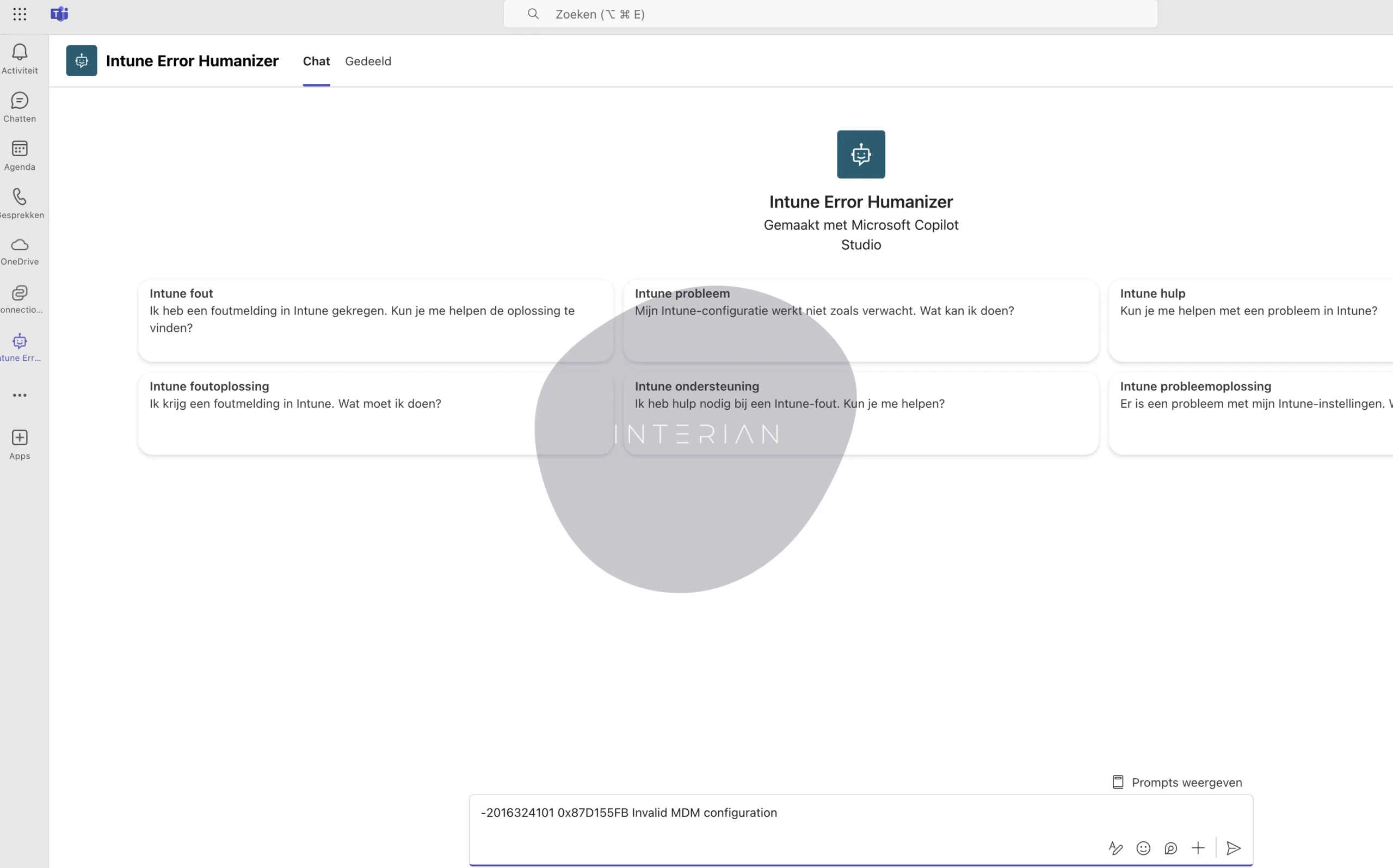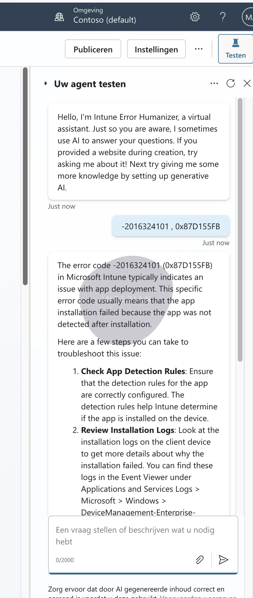 - Interact with the agent: Input an Intune error code or ask a question, like “What does error -2016324101 mean?” The agent will respond with a clear explanation and suggested fix.