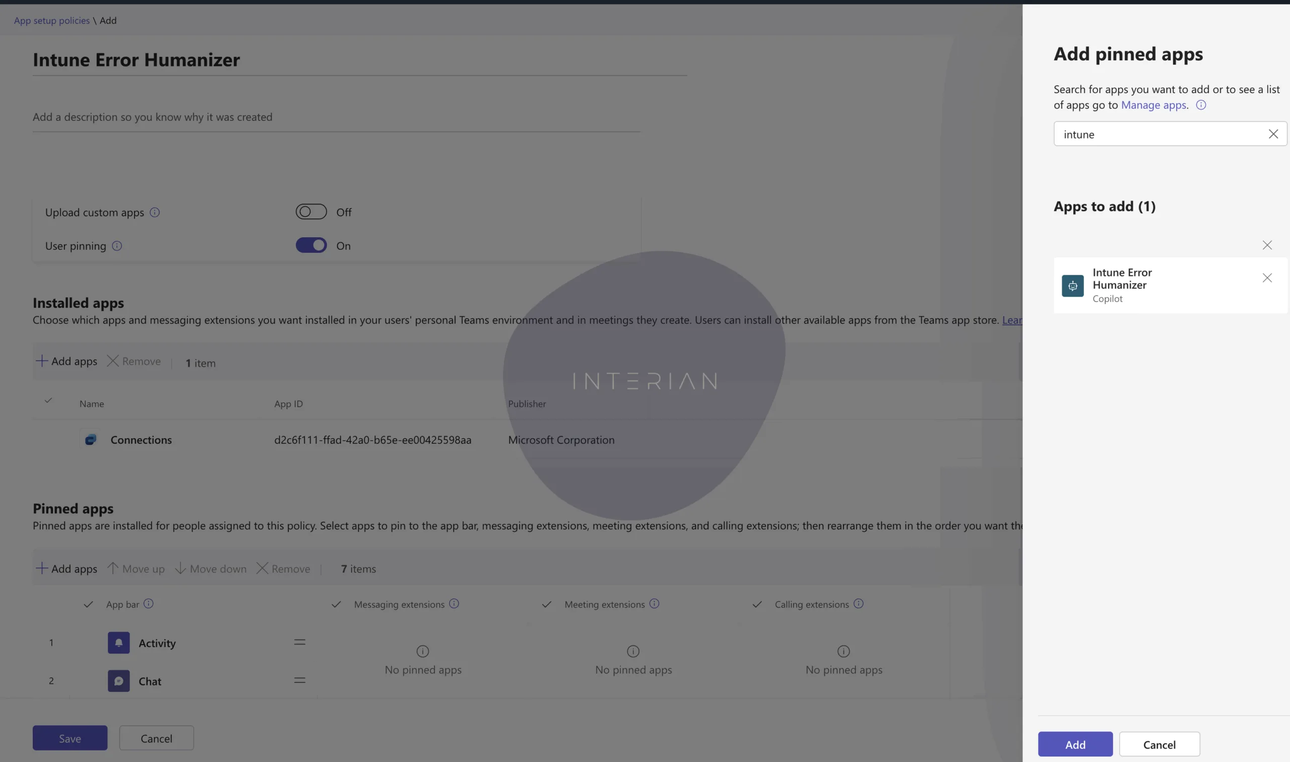 - Create a policy: In the Teams Admin Center, set up an app pinning policy to add the “Intune Error Humanizer” app to your IT team’s Teams sidebar.