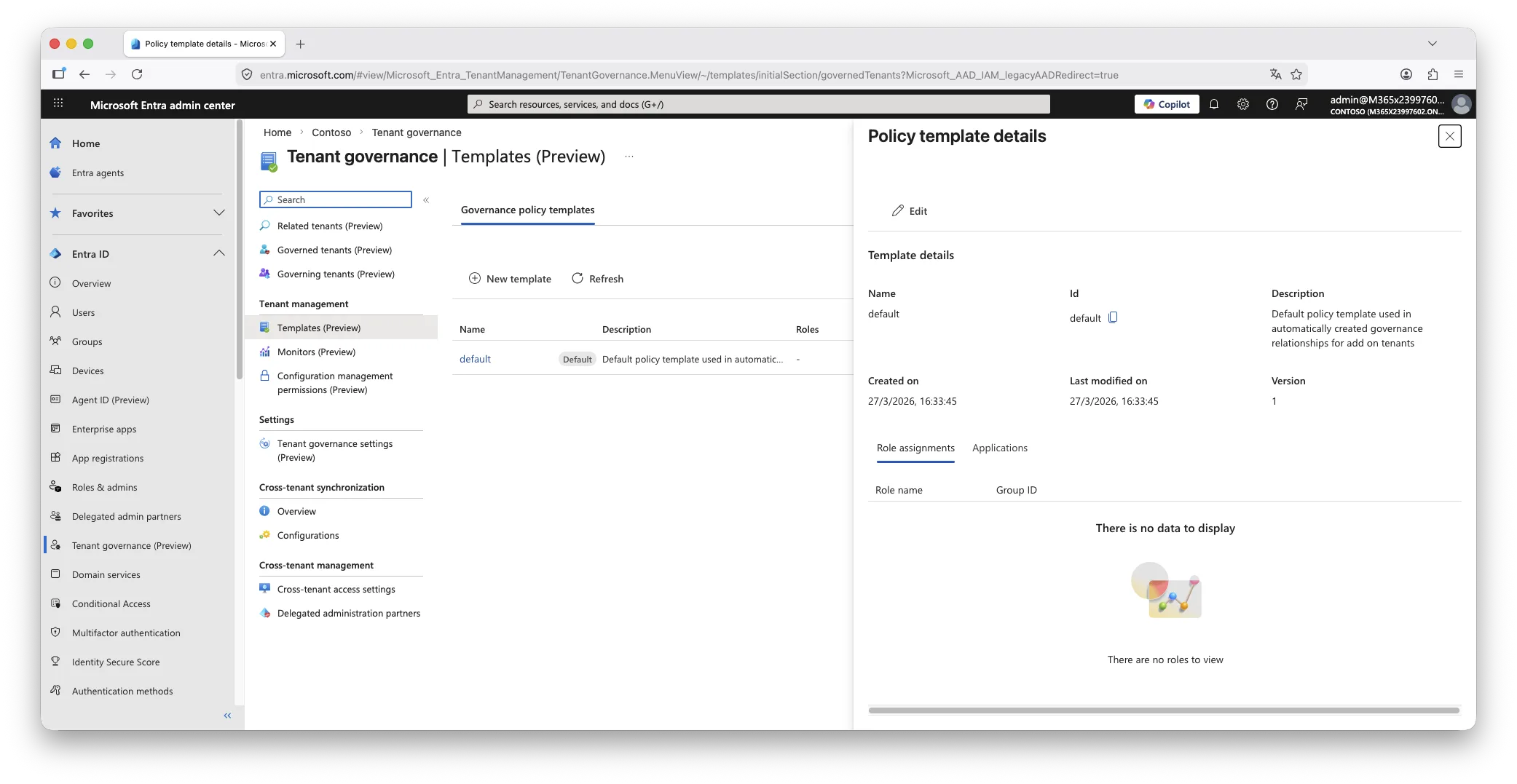 Templates are managed centrally from the governing tenant. One governance nuance worth understanding explicitly: modifying a template after a relationship has been established does not automatically update that relationship. To apply changes, a new request and approval cycle must be initiated between the two tenants. This is intentional behaviour, not a gap, but it is operationally significant when you need to change the scope of access across a large estate.