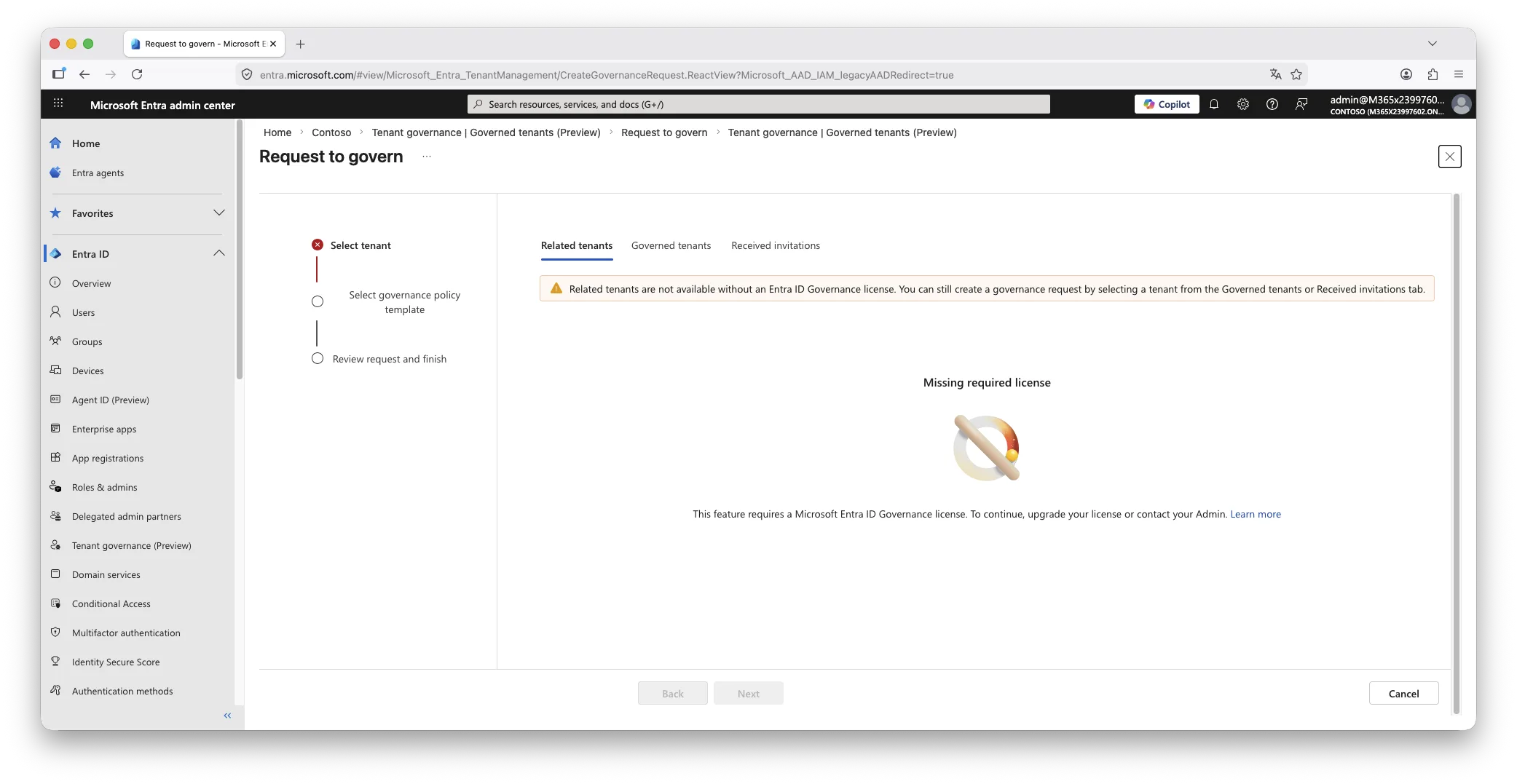 The reason: this role can create, approve and modify governance relationships that establish cross-tenant administrative trust. A governance request sent from another tenant carries a policy template that defines which administrative roles the governing tenant’s users will hold in the governed tenant. An administrator holding Tenant Governance Administrator can accept that request, and in doing so establish a delegation of access to an external party, without requiring Global Administrator rights on the accepting side.